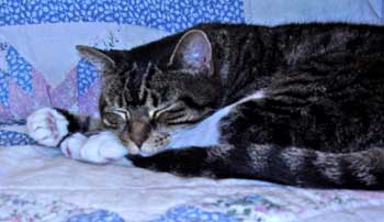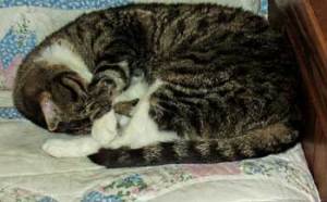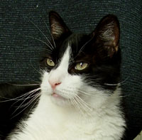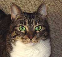 I rescued Claude at the age of 5 weeks from a railroad bridge where he was waiting, no doubt, to be hit by a car or go over the edge and a 100′ drop. I hadn’t wanted a kitten, (because I would take an older cat, a pair that couldn’t be separated, a handicap, etc.), but felt he was meant to be mine. When I saw him run under the chin of my 12 year old pit bull terrier, Chloe, I knew it was true. Chloe raised him pretty much with her energy. He does all kinds of tricks no self-respecting cat would ever do, ergo the name, Claudie the Dog Boy, and is a bit on the goofy side.