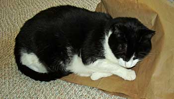 Not to be left out, Claude, a.k.a. Claudie the Dog Boy, decided to sit up and get his mug in the camera. But it didn’t take terribly long for him to give it up and find his catnap spot on their favorite brown paper bag. He couldn’t keep his eyes open and was soon out like a light, too.