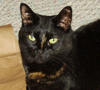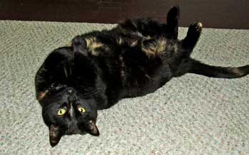 Gypsy Rose was another rescue from that park who’d been living in the adjacent cemetery; I snatched her while riding through one morning to work. She was 6 months old at the time. What’s so unusual about Gypsy is her tortoiseshell markings – she has touches on her face, chest and paw, stray hairs through her body, but all her bright, flashy colors are on her tummy! Gypsy is the top cat and the most independent.