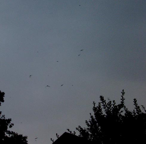 I stand on my back porch, lean on the railing. The sky deepens and I watch in amazement, perhaps for 20 minutes. I am mesmerized by these flickering shadows on a blue-grey canvas. I am happy to be a part of their evening repast, if only as a bystander.