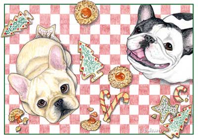 It’s not too late! Still looking for the perfect French Bulldog Christmas card or holiday card? Here it is – my Naughty but Nice card! My own artwork of two mischievous Frenchies who managed to get on the kitchen table and into the Christmas cookies! Inside message says “Warmest wishes for holidays that are simply delicious” with a half eaten cookie, of course. I will ship same or next day, but supplies are becoming limited, so hurry!