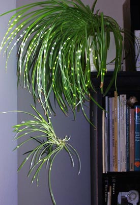 As I walked down my upstairs hallway the other morning, I noticed that the spider plant atop one of my bookcases looked outright sparkly. The morning sunlight was filtering through the mini-blinds and creating this wonderful pattern on only the plant. This time it was easy to run and get the camera.