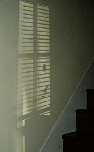 Because this play of light was so striking, I became aware as I walked about the house of the other spots where that same sunlight/mini-blind phenomena was occurring. There were several spots, but the other one that was noteworthy to me was this image at left, along the stairs, where the silhouette of the rusted tin horse seemed a special little vignette all its own.