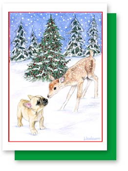 At right is Frenchie Makes A New Friend, with the message “The gifts of love and acceptance are given now in this wonderful season and all year `round. Enjoy your present. Happy Holidays”, picturing a black-masked fawn Frenchie meeting … a fawn.