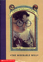 I must say, as I read The Miserable Mill, the 4th in the Lemony Snicket series, I wondered what would be the attraction for children in a continuing series of misfortunate events happening to the Baudelaire orphans. It just seemed like an awful lot of doom and gloom … not that I am one to revel in endless parades of flowers and fairies … but I was curious as to the attraction of the never-ending succession of misfortunes that befell the three main characters – Klaus, Violet and Sunny.
