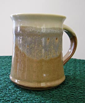 Just to give you an idea of the wonderful dishes that call my table and cabinets their own are the following … a set of Johnson Brothers china, (given me by my college roommate), a complete set of Vernon Ware, which is like a soft-hued Fiesta Ware, (dishes I grew up with),  a 1920’s set of hexagonal amethyst glass dishes, (I paid $15 at the first auction I ever went to with my friend, Jan, in the late 80’s), a Royal Doulton Art Deco tea set missing a sugar bowl, (dirt cheap on London’s Portobello Road in the mid-70’s), hand-thrown bowls, large and small, and serving dishes and casseroles, (all gifts), cobalt crystal tumblers, ( a gift), and …. a lovely assortment of “factory-second” sets from Pfaltzgraff’s factory outlet, ( at $1 and $2 per piece), when they were still open in Flemington. I also have a gorgeous set of hand-thrown stoneware glasses and plates to whose talented creators I happily paid a fair price. And, of course, the hand-thrown mug you see pictured. (In all honesty, there are still more odds and ends in more hand-thrown mugs, pie plates, glasses, serving platters, etc. gathered over the years.)