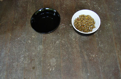 The photo below tells a story that may or may not have interest to you, but it definitely does to me. You may not even see the story right away. But stick with me. By way of background, I put food and water on my back porch for the 2 cats next door who are outside most of the time, and often visiting me. In time, a small tuxedo feral whom I’ve named Little Fee found the food, and now he’s a regular. I feed him morning and night, and he can graze whenever he’s inspired until I bring the food in. But who else is at the food bowl?