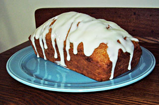 I got out all the dry ingredients and mixing bowls, loaf pan, etc. last night and grated the carrots. After feeding the small fry this morning, I opened up the windows to a nice cool 65˚, whipped it together and popped it in the oven. Voila! a cooling carrot bread at 7:50 a.m.! By the time you see the finished photo with a cream cheese icing, it will be a few hours later.