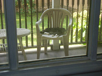 Imagine my surprise when I went into the kitchen for coffee late this morning and saw none other than Little Fee sound asleep on one of the back porch chairs, (see photo above), looking for all the world like he lived here and was just napping. I say surprise because I have never once seen this cat sound asleep on a chair on my porch – he seemingly just discovered it as an actual possibility. I took the photo through the closed back door and storm screen. If I’d opened it, the moment would have been lost, and since my intention is not for a gallery shot so much as a moment, it’s as unfocused and grainy as it is.