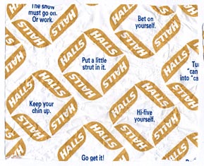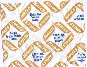 Finally. My head was starting to clear a wee bit from this seemingly endless flu/virus/whatever and I actually had something I wanted to write about. So I popped a Halls honey-lemon cough drop, gathering my thoughts, and then was stopped in my tracks. There was a message on my cough drop wrapper!