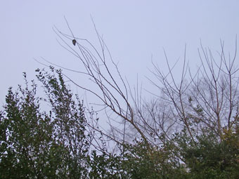 Many of the taller shrubs and a fair amount of surrounding trees still have quite a bit of their leaves. This tree? Only one stubborn leaf remains. I wonder did he win a contest this year with some other now-fallen leaf who could finally hold on no longer. Or is he a tall scout, updating the lower shrubbery on how advances the autumn. Or perhaps he’s simply the last man standing.