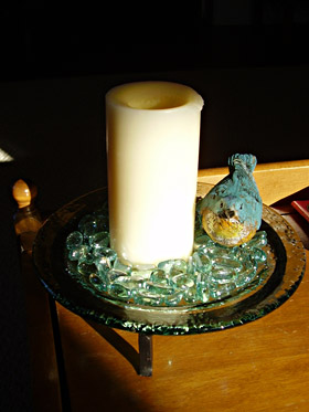 As I enjoyed the luxury of journaling this morning, the sun had risen and was angling its light on the small pool of light blue marbles in the plate on my coffee table. As Spring approaches, I put away fall and winter candles and decor, and had just recently encircled a vanilla pillar candle with a small pool of blue in which this little bluebird could wade. The sharp sunlight was just dancing off these simple blue gems, and both they and the textured glass plate beneath were sparkling.