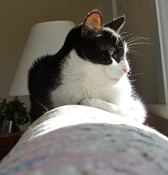 Back to that warm morning sunlight streaming through the front window. Claude, pictured above, often takes this position in the morning after breakfast and basks somewhere along the back of the sofa, though this particular spot is preferred. I took a bunch of shots of him, always marveling at how elegant and sophisticated he appears in his photographs when in fact, he is one of the goofiest animals I have ever known. I had a nice selection of Claude, the sun worshipper, to choose from.