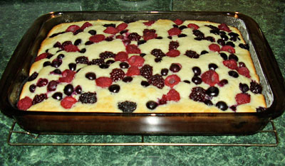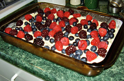 I used three very full cups of berries, one each blueberries, blackberries and raspberries, and here it is ready to go in the oven.