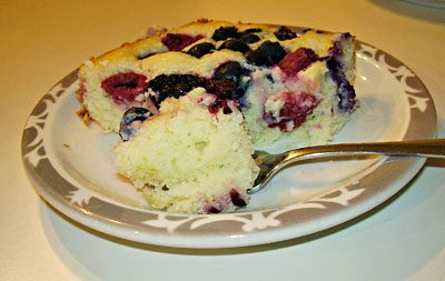 The cake turned out well, and was very moist. It’s all butter and includes buttermilk, so it’s hard to go wrong on that count, and the berries got soft and mushy, dropping through the batter. Although the grated lime and fresh lime juice gave it a nice tropical kind of kick, I am thinking now that I might like it even better with lemon instead of the lime. And there’s always more time to bake with berries in season.