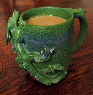 Well, it started to rain and we were done anyway, so onward to home. It wasn’t too long before that gorgeous mug was holding coffee. This mug is not on Marian’s web site, though something similar with frogs is. How gorgeous is this! It’s frightening to think how much I could have bought at this event if I really had more money to spend. But spending it with someone who makes art for their living, who brings their heart and soul to their craft … it seems supporting such artists is always money well spent.
