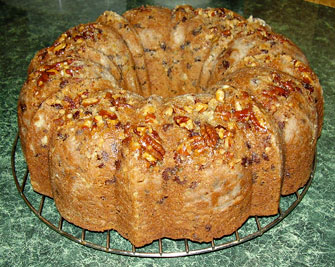I’ve made this chocolate chip bundt cake once before and chose it again because it is so unbelievably moist and delicious. It’s all butter with plenty of dark brown sugar and buttermilk. What makes it extra tasty is a blend of chopped pecans, butter and sugar which are mixed together and spread in the bundt pan before the batter is spooned in. It adds a just-right, sweet crunch that complements the dark chocolate mini-morsels.
