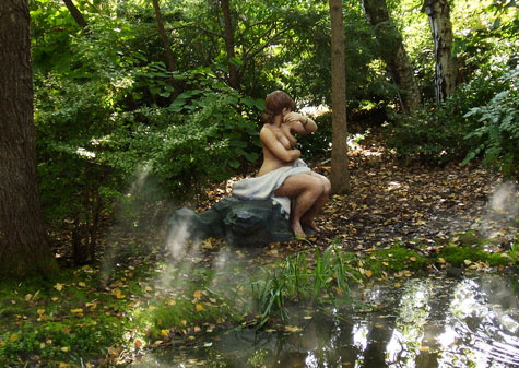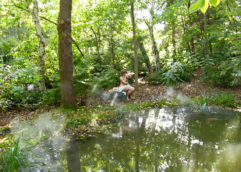 As we walked further, we noticed another of the lifelike and life-size human sculptures, a woman bathing by the edge of a pond in the forest. The whole setting was just exquisite.