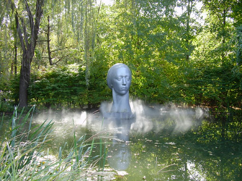 As we approached the Grounds for Sculpture‘s restaurant, Rat’s, there was a pond to our left, with a sculpted head surrounded by mist, reflecting the slanted rays of afternoon sun.