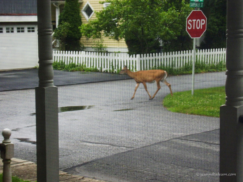 Working at my computer just this past June, I looked out front and saw a doe nonchalantly strolling down the street. She did not observe the Stop sign, but continued walking, looking for the tastiest greens she could find. Unfortunately, this is at a particular neighbor’s home who happens to be the most ardent gardener for a few blocks around. Of course! She has the delicacies!