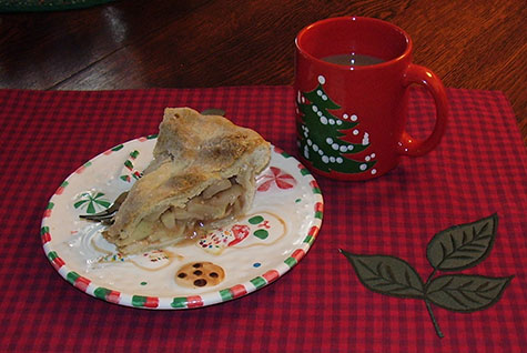 At my house, it’s the appearance of my favorite Dollar Store Christmas plates and German Christmas mugs. I find them so simple and festive that I can’t help but get in the holiday mood when having coffee or serving up something good to eat, like a slice of yesterday’s Thanksgiving apple pie. Yum.