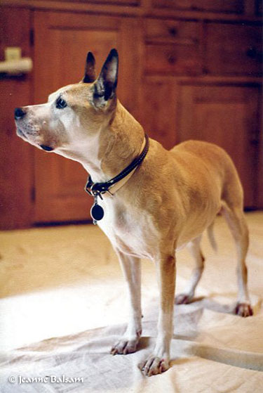Another photo in the kitchen. Here was my old girl, Chloe, then nearing 15 years – the most lovable, trustworthy and phenomenally stubborn dog one could ever hope to own. (Yes, she’s on the drop cloth.) Behind her was a complete wall of original wood cabinets and drawers, any kitchen-lover’s dream. The original wainscoting was also intact, unpainted. Throughout the house there were chair rails with beautifully coordinated colonial colors and petite flowered wallpaper above the rail. There were also closed-over fireplaces in the living and dining rooms and the master bedroom. Again, just as well for one with no knowledge of building or watching over fires.