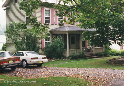 Above you see the first house I lived in when I moved to the western side of New Jersey in a tiny rural town called Pattenburg, once a center of basket-making and peach growing. These were all taken to market on the trains that ran the (still active) tracks at the far back of my property. The land itself was 1/2 acre and an absolute marvel to this girl who’d been living in an (albeit huge) apartment. The property was on the narrow side and quite deep with 14 deciduous trees, and I sure got my exercise raking each fall and mowing.