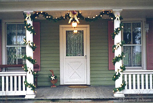 The house at Christmas, my tree in the dining room at right, not visible in this photo. I decorated the garland with white lights, gold bows and small pink roses to complement the house. It always looked wonderful. At the holidays, our little Main Street was all aglow, looking for all it was worth like a slice of another time with beautifully lit houses, and neighbors happier still, all of us waving at one another, wishing each a warm Merry Christmas. Life was good.