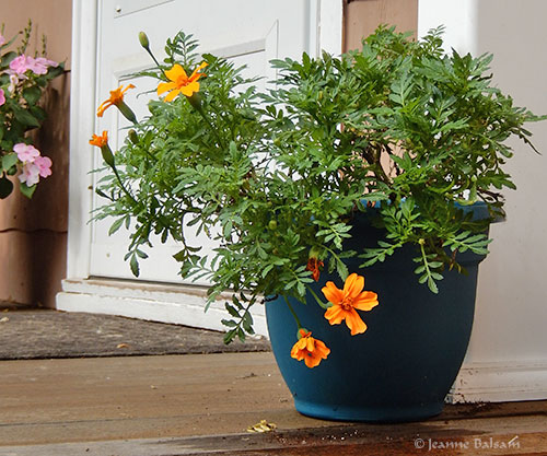 This is a very flattering angle for these marigolds. They did very poorly this year, whether it was the plants, or me over/under watering them, I don’t know. But they did look pretty in the royal blue pots I got for them.