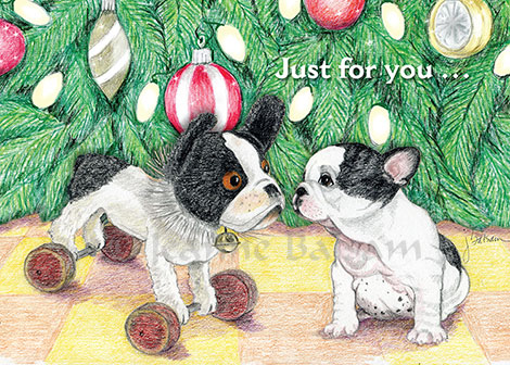 Please welcome not only an adorable little Frenchie baby, but a touch of nostalgia for times gone by, when a child might be excited to find a real Steiff pull toy underneath the tree. The lights were much bigger, the ornaments glass, and the smell of balsam pine wafted through the house.