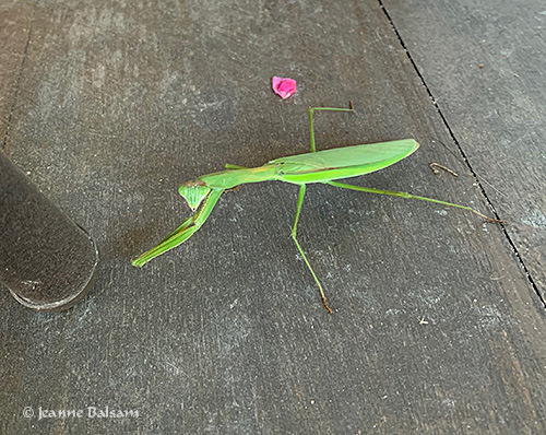 Yes, two different subjects. Remember that very young praying mantis I had shared a few posts ago? She was hanging out on my kitchen window screen, looking just adorable, as all babies do. Well, I went out my kitchen/back porch door the other day, and who do you think was there waiting for me? That little mantis all grown up. Can I be sure it’s the same one? Possibly not, but she’s the right color and in the same area as the youngster.