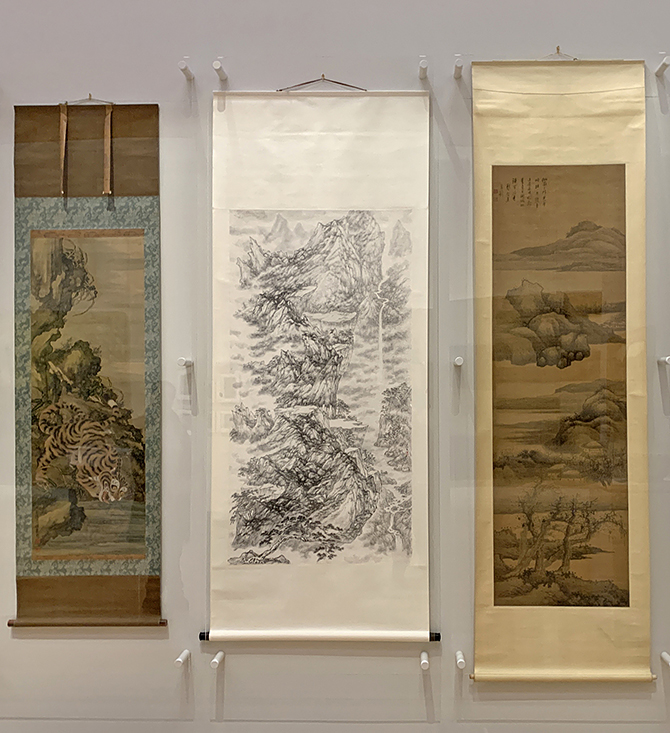 L to R – “Tiger Drinking from A Stream” – Yumashiro Yuhi, October 1761, Ink, color, gold pigment on silk; “Bridge to Heaven 2006.2” – Arnold Chang, 2006, Ink on paper; “An Immortal’s Abode Above the Clouds” – Gong Xian, mid 1680s, ink on silk.