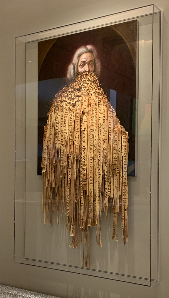 “To Be Sold” – Titus Kaphar, 2018, Oil on canvas with rusted nails. References the sale of 6 enslaved persons belonging to a former president of the university on this site, 1761-1766.