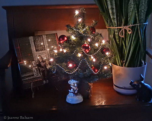 A friend and neighbor, in the face of my treeless status, offered me a small one she had and no longer used. Of course, I have a bazillion ways to trim it collected over the years, but I also had easy access to a few things. There it is, on my oak bench where I can enjoy it when I journal, read, or soon … write rather late Christmas cards.