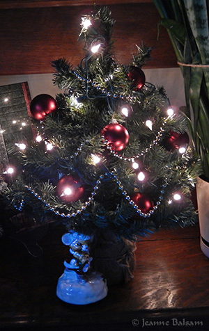 The good thing is that Jazzy, unlike previous pets, has not decided to pull it over or de-trim it. The first of my beloved pets to have me reconsider the wisdom of having a tree was Mewsette. As is true with many felines, she did her best work at night, and every morning I would come down to find at least the bottom tier of ornaments missing, some broken. OK, let’s just put unbreakable ones on the lower branches. It minimized breakage but didn’t affect one iota my having an ornament scavenger hunt each morning. The final result? Nothing detachable at the bottom of the tree. Not very pretty.