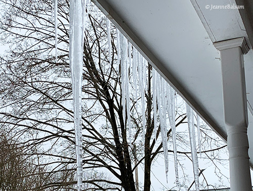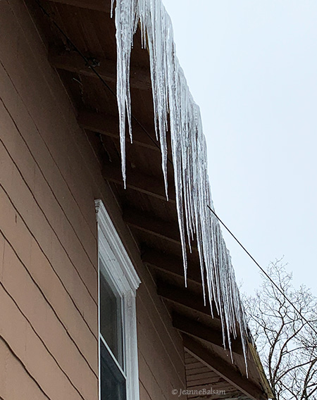 Icicles. Yes, long dagger-y icicles that dare you to walk beneath them. There was just enough warmth and/or blunted sun to have them start breaking, and as I sat at my desk working, or journaling in the morning, you could hear them occasionally crashing to the ground below. When my oil delivery fellow came, I went outside to tell him to stay flush against the house, pointing up. He did … and flattened himself. But being young, he then skated across the ice on the ground, yelling “Wheeeeee!” as he slid to the driveway and went back to his truck. I could only smile.