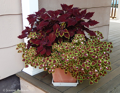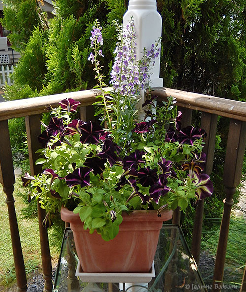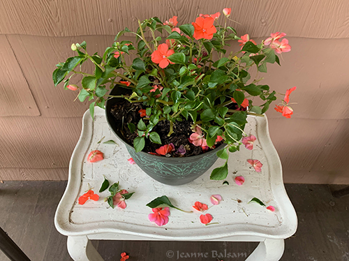 One morning, I looked out my kitchen window and saw something indiscernible in between two of the ornamental grasses out back. It looked like a face. Oh …. it WAS a face. The face of a very young (and adorable) deer holding very still but just about ready to chow down on a hosta. I went down the porch stairs to gently shoo her away. Maybe only 4-5 months old, she easily cleared the nearly 4′ garden gate. As I returned, I saw she had been on my porch, and had eaten the front half of the impatiens above and a few other potted plants. It’s discouraging, but that little wide-eyed face holding soooo still, trying to be invisible …
