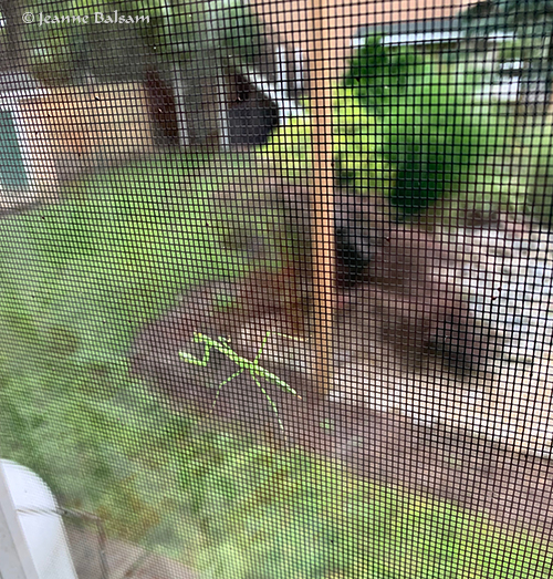 All I could think of was that that must be what `biological imperative’ means. He knew where he was going and what he had to do, because at the other end of the porch is where I often see adult green praying mantises, like the one next to Pumpkin in a photo from a few years ago.