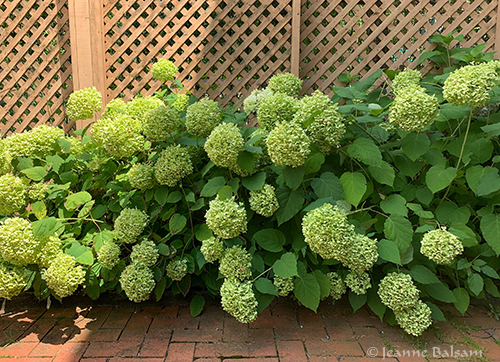 There are snowball hydrangeas all over this property. They bloom snow white, and are now in their green phase, to turn a stunning rust as the summer wears on, and it becomes cooler.