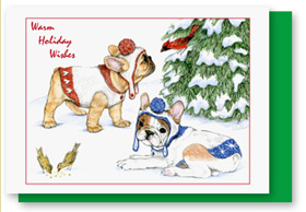 There’s still time to order! If you’re a French Bulldog lover or just want to send out a warm holiday greeting with artwork featuring this adorable breed, take a look at my Frenchie holiday cards. I have several to choose from, all with lovely messages, and the original artwork is, of course, mine.