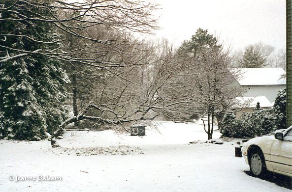 The backyard in snow. And this only shows a portion of it. There’s another third of the land beyond that farthest point you can see. Plus this doesn’t give a hint of the lush blossoming of endless perennial plants, shrubs and trees that were on this property. I have so many photos of the flowers all about – small areas of blossoming beauty – that I’d be here for days just trying to find and scan photos of the riot of color that abounded in spring and summer.