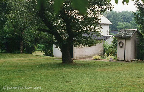 There you see an aging apple tree which was a major attraction in the fall. It was not unusual to look outside and see deer, rabbits, and groundhogs all together enjoying what had fallen to the ground. As the ancient tree had not been well-cared for, the apples were not really edible or pie-worthy, but few went wasted. At the right, the ubiquitous outhouse, an often-rescued fixture on every property on Main Street.
