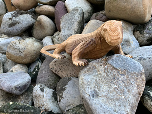 I went out to get the mail down at the road, and my 6-year-old neighbor was taking an outdoors break from his online school day. He had a white toy animal which he quickly explained to me was a Komodo dragon he’d gotten for his birthday last year. “Wait!” I said. “I have a Komodo dragon, too!” And I showed him what you see below. He loved it, but was called in by his Dad for his next class. Inspired by his enthusiasm, I took a few photos and texted them over to my friends for him.