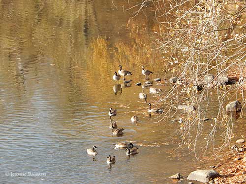 A group of Canada geese swim, relax, and feed at the edge of the riverbank.