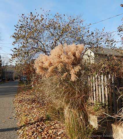 Ornamental grasses flanking a walkway sport their furry blooms. Many trees in the area have lost the majority of their leaves.