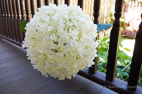 A few of these rhododendron bushes grow in the yard surrounding the porch. These “snowballs” are stunning and huge, about 8″ across.