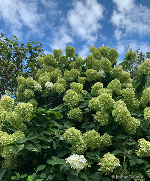 Snowball hydrangea changing into their late summer green phase still evidenced some fresh white blooms, in denial of the coming fall, and the crisp, dry temperatures.