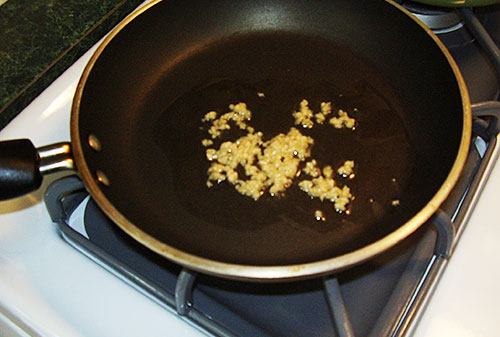 I sautéed 2 cloves of garlic in just a tablespoon of extra virgin olive oil. Meanwhile, I whisked up a little vegetable broth using an organic vegetarian base that I was happy to discover on my supermarket shelf so I wouldn’t have to waste a can or box of broth for such a small amount.